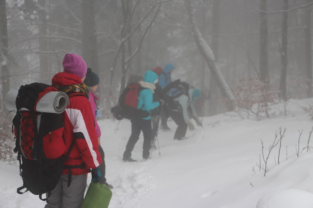 Niestety pogoda tym razem nas nie rozpieszczała. Śnieg, który leci akurat w oczy, okropna mgła, ślisko. Kolejnym demotywującym faktem dla mnie był brak wody i czekolady. Niestety wszystkie sklepy były zamknięte, a we mnie rodziło się pytanie ” jak wytrzymam bez wody przez najbliższe 2,5 godziny?” . Miałam kryzys, ale wiedziałam, że nie zrezygnuję chociażby mieliby mnie zabić. Początek trasy zaczął się stromymi podejściami, wtedy już miałam ochotę zdjąć plecak i wcisnąć go w ziemię albo wystrzelić w kosmos. Na szczęście szybko się ogarnęłam, trzymaliśmy się wszyscy razem. Każdy był dla siebie wsparciem, nie brakowało humoru w cięższych momentach. Zdobyliśmy Czupel (933 m n.p.m) , niestety mgła nie pozwoliła nam niczego podziwiać. Gdy doszliśmy do schroniska PTTK na Magurce, szukałam tylko wody. W momencie gdy ujrzałam magiczną cenę 8 złotych zamurowało mnie. Ale cóż zrobić, gdy potrzeba jest silniejsza. Schronisko przepełnione, ciężko znaleźć miejsce, bardzo drogo. Byliśmy bardzo wygłodniali, niektórzy zamawiali 3 dania ( pozdrawiam Ciebie Aniu!). Gdy już odzyskaliśmy energię, ruszyliśmy na dół. W pogoni za pociągiem, na który ( istniało prawdopodobieństwo), że nie zdążymy. W życiu nie widziałam, ludzi, którzy tak pędzili na szlaku. Zejścia dosyć strome, kamieniste oraz śliskie. Muszę przyznać, sprawnie oraz szybko nam to poszło ! Trasa wyniosła ok 16 km.